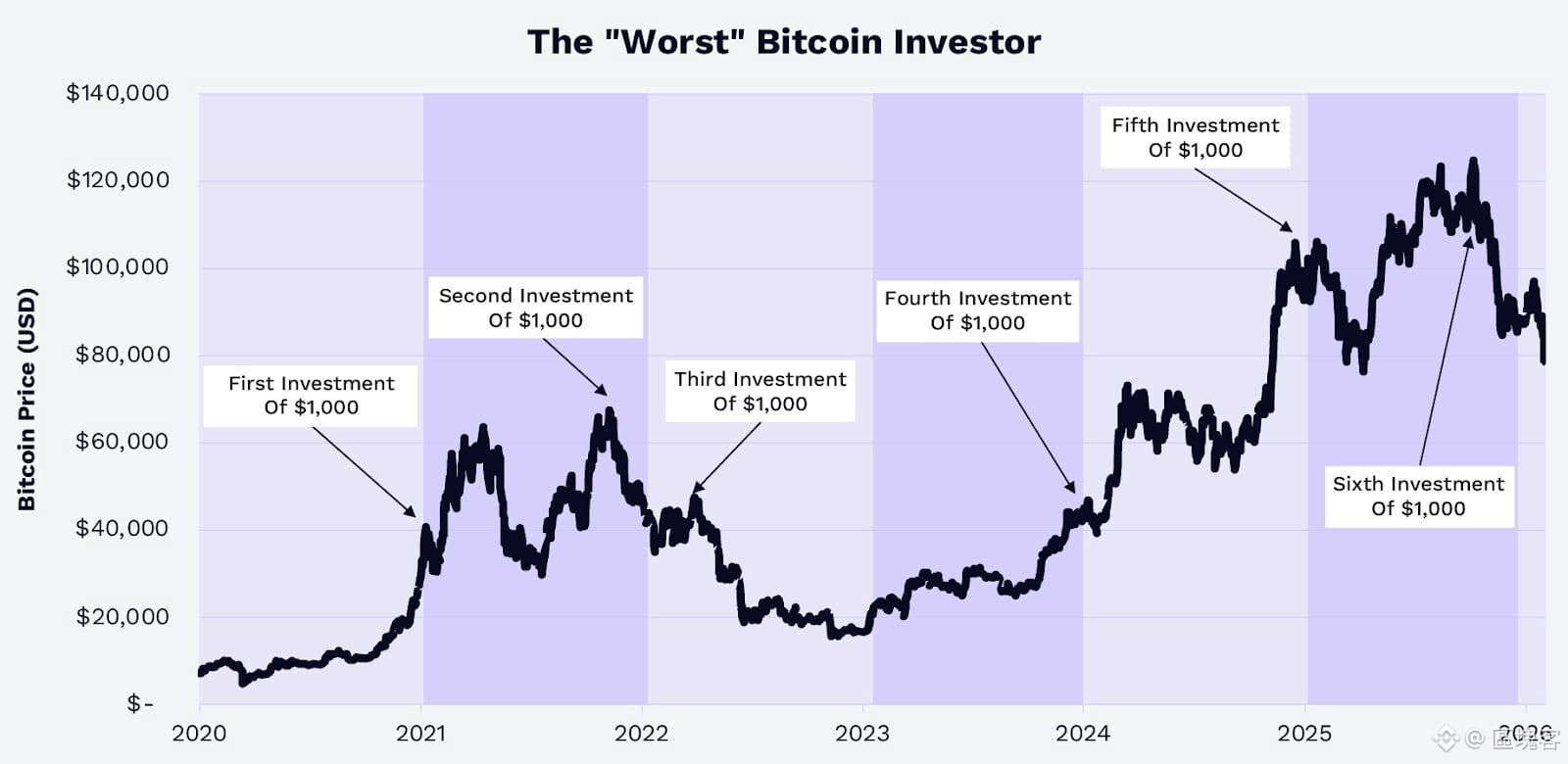 根據 Glassnode 數據,假設一位「運氣最差」的比特幣投資者,從 2020 年到 2025 年,每年都在最高價位投資 1000 美元,他的投資額約為 6000 美元,到 2025 年 12 月 31 日將增值至約 9660 美元,到 2026 年 1 月 31 日將增值至約 8,680 美元,收益率分別約為 61% 和 45%(如下圖所示)。即使考慮到 2 月初的回調,到 2 月 8 日,這筆投資將達到 7,760 美元,收益率約為 29% 。