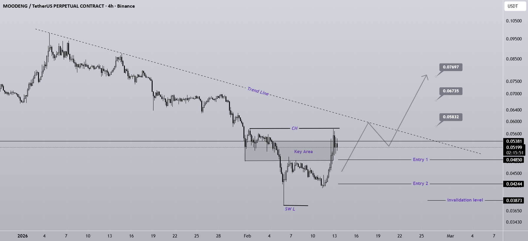 Se pare că Moodng a format un fund semnificativ și important, indicând o potențială inversare a tendinței sau o fază de acumulare. Recent, prețul a scăzut sub o umbră inferioară lungă (coroană), arătând o presiune puternică de vânzare, dar s-a recuperat imediat. Această reacție sugerează că cumpărătorii apără activ această zonă și că cererea este prezentă la niveluri de prețuri mai mici.