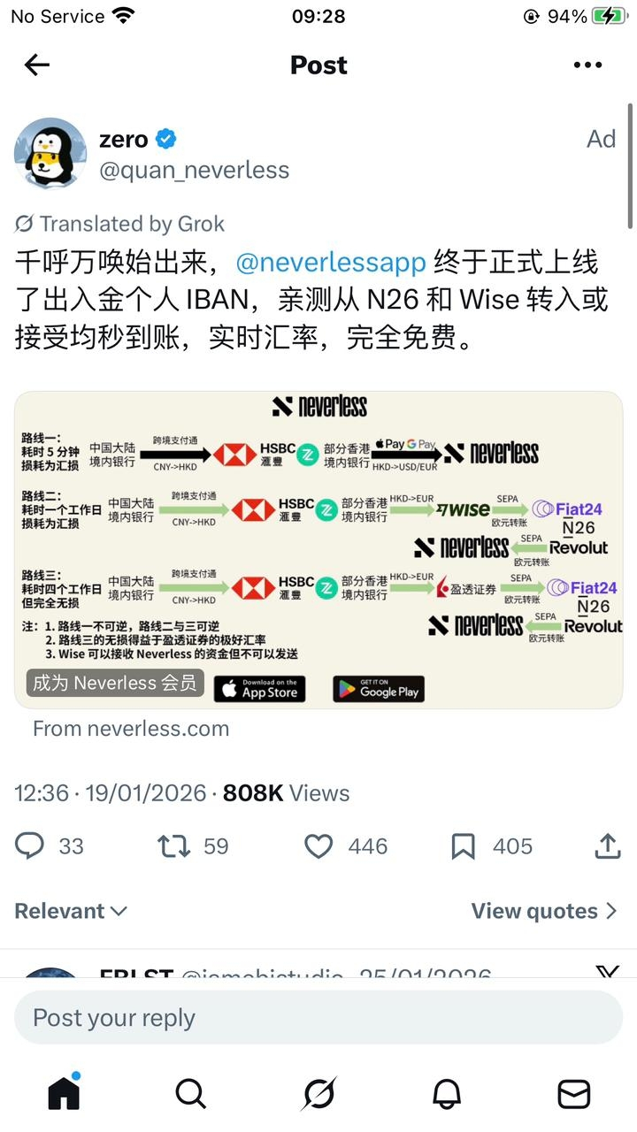 聊完赚钱,我们再来说说币圈人永远的痛—— 出入金。有多少兄弟因为银行风控、高昂手续费、漫长到账时间而焦虑?Neverless 在这一点上,简直是打出了一张王炸:个人 IBAN!