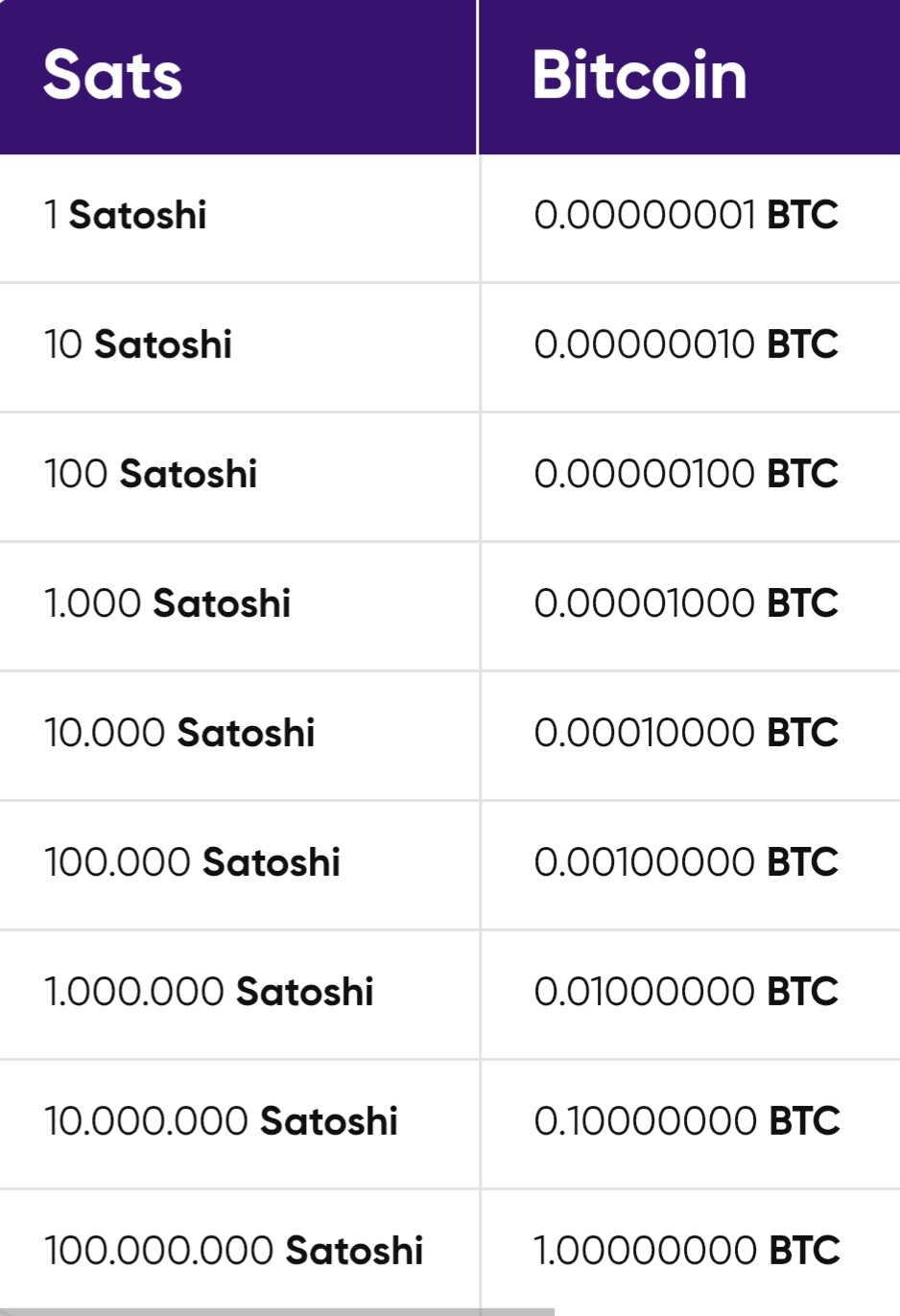 Sats, ou “satoshis”, são a menor denominação de bitcoin que é registrada na blockchain do Bitcoin. Um sat representa 0,00000001 BTC, ou 1 centésimo milionésimo de bitcoin. O nome é tirado do pseudônimo criador do Bitcoin, Satoshi Nakamoto.