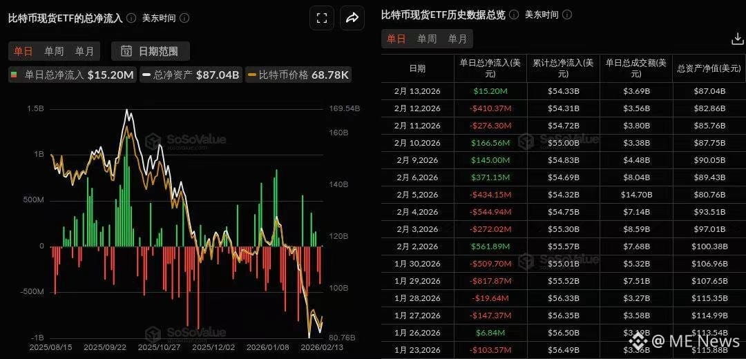 ME News 消息,2 月 14 日(UTC+8),根据 SoSoValue 数据,昨日(美东时间 2 月 13 日)比特币现货 ETF 总净流入 1520.29 万美元。