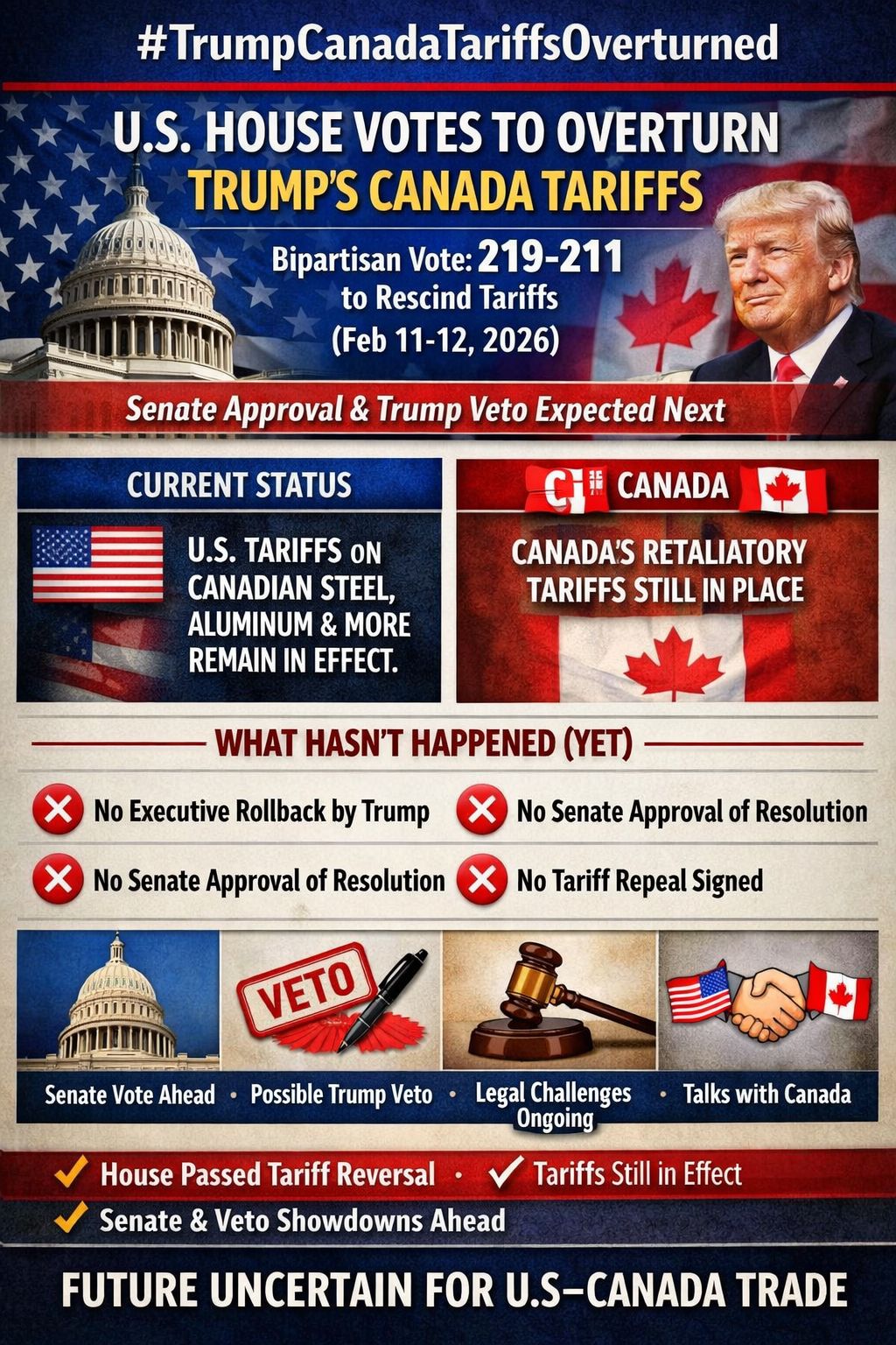 On February 11–12, 2026, the U.S. House voted 219–211 to approve a resolution aimed at rescinding Trump’s tariffs on Canadian goods — a rare bipartisan rebuke of his trade policy. Six Republicans joined Democrats in support. �
