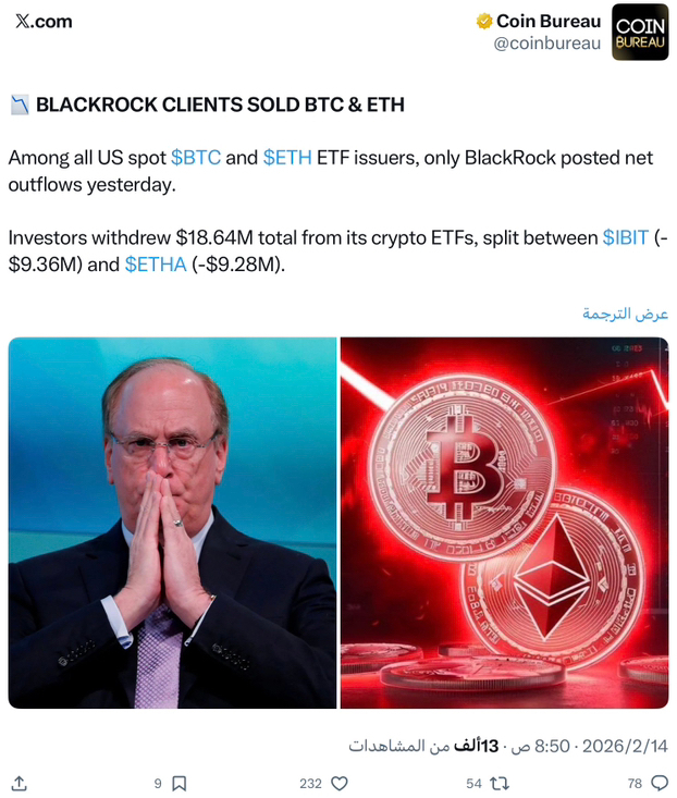 شهدت صناديق الاستثمار المتداولة الفورية للبيتكوين (IBIT) والإيثيريوم (ETHA) التابعة لشركة بلاك روك تدفقات خارجة بقيمة 18.64 مليون دولار في 13 فبراير 2026.