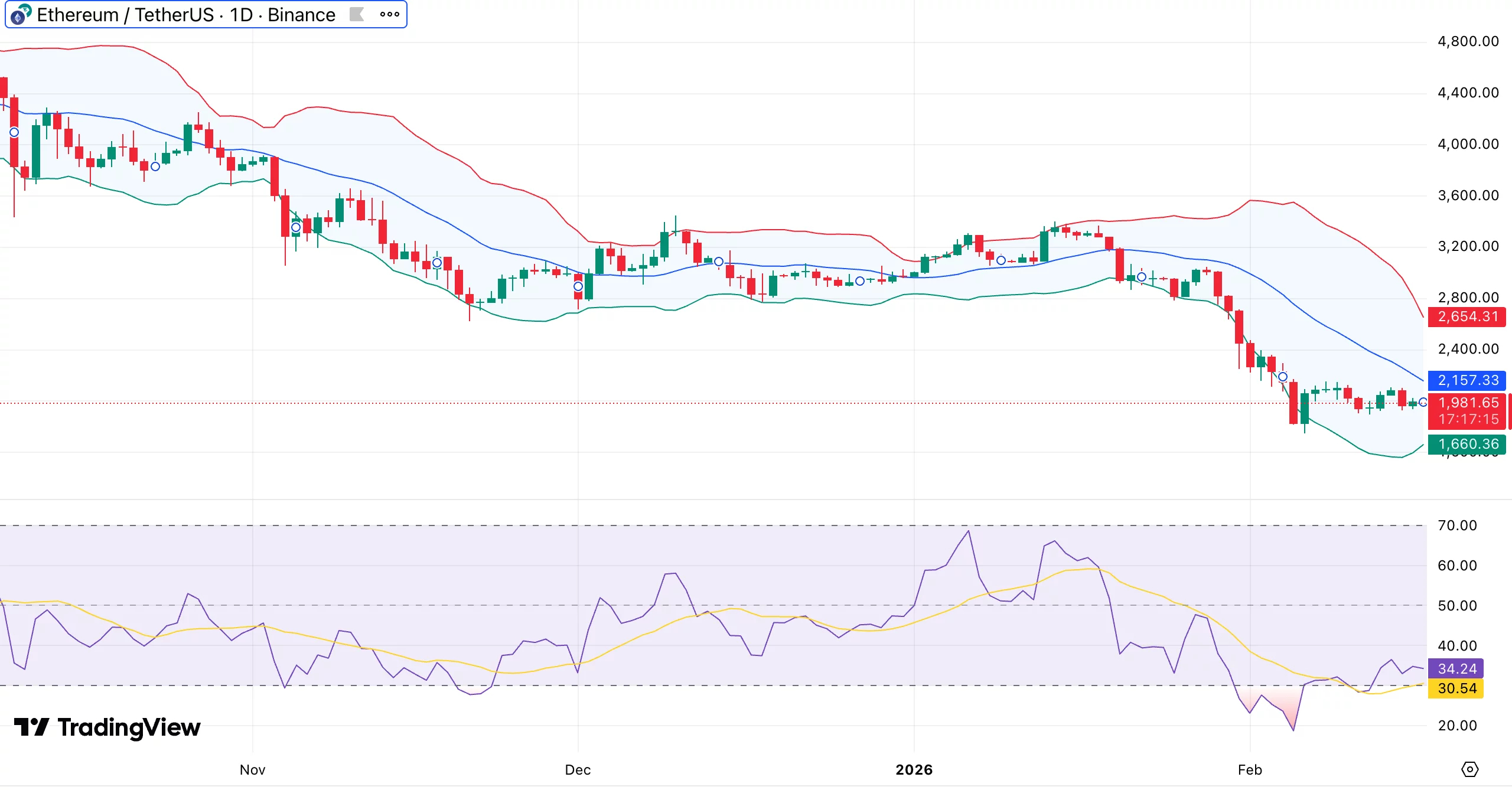 (以上为2026年2月ETH整体走势参考图,清晰显示当前低位震荡+下行压力,布林带下轨附近正是关键战场)