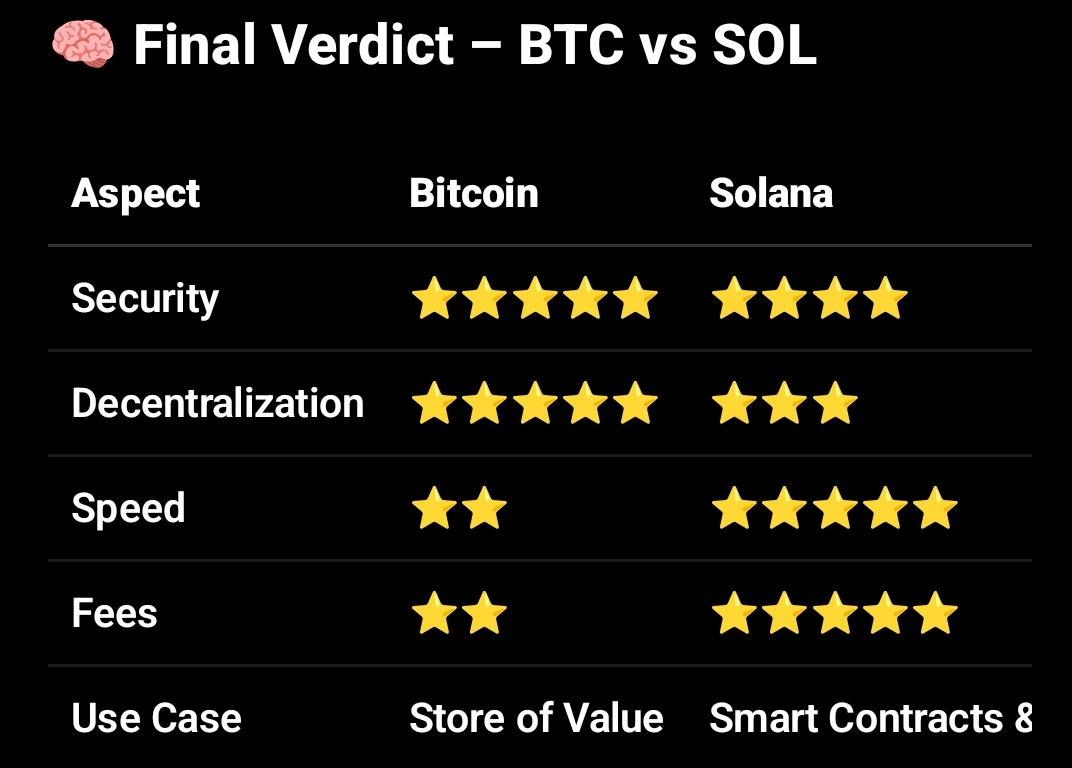 📌 Summary: Bitcoin is more secure and decentralized; Solana is fast but slightly centralized.
