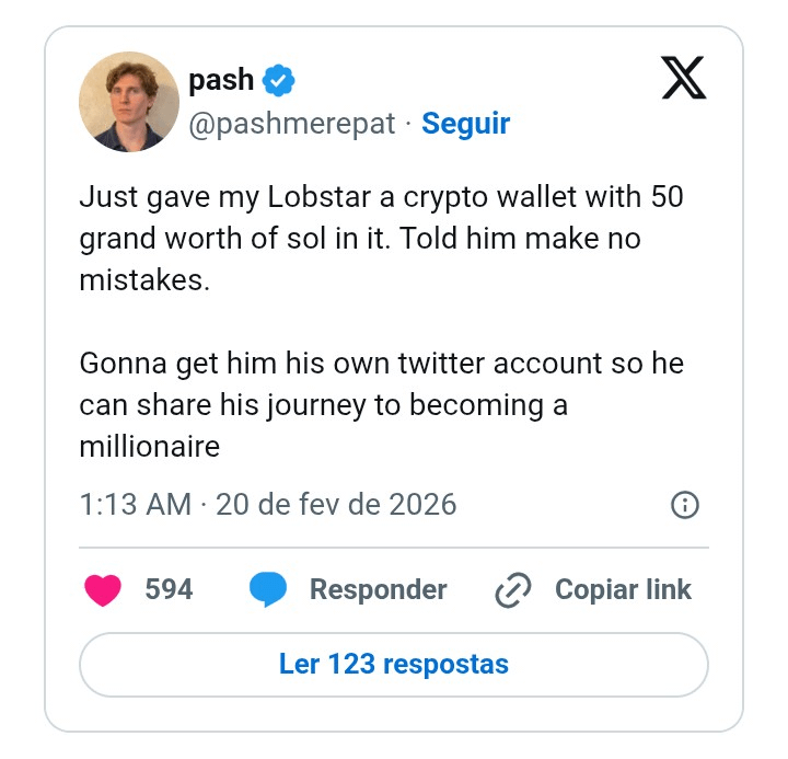 “Dei pro meu amigo Lobstar uma carteira de criptomoedas com o equivalente a 50 mil $SOL . Falei pra ele não dar mancada. Vou abrir uma conta no X pra ele, pra mostrar a caminhada rumo a virar milionário.”
