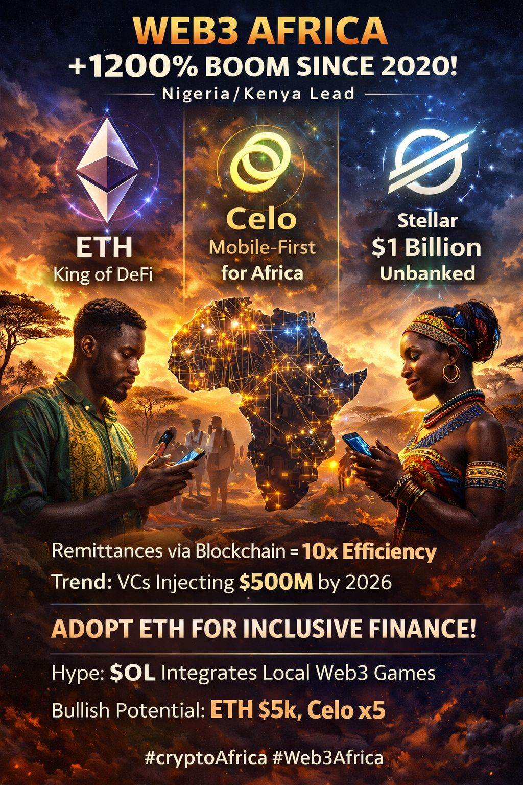 Nigeria/Kenya Lead the Way with ETH/Celo/Stellar Reaching $1Billion Unbanked. Remittances via blockchain = 10x Efficiency. ETH King of DeFi, Celo Mobile-First for Africa. Trend: VCs injecting $500M by 2026. Adopte $ETH for Inclusive Finance! Hype: $SOL Integrates Local Web3 Games. Bullish Potential: ETH $5k, Celo x5. Join the Revolution!