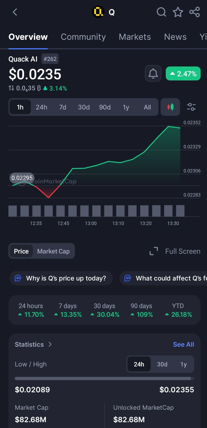 In the last 90 days, $Q has grown roughly +109%, which is basically doubling even while the broader market has been uncertain or bearish. That kind of performance isn’t typical during tough market conditions. It tells you the project has its own momentum separate from outside noise. This isn’t a sudden hype push, it’s structured, steady growth. When a coin performs this well in a rough market, it usually means people truly believe in it.