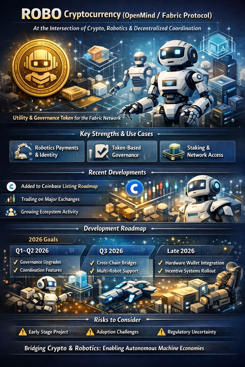 @Fabric Foundation Robo is a utility and governance token designed to support the Fabric network, a blockchain-based infrastructure aiming to coordinate autonomous robots, on-chain payments, identity systems, and robot task settlement. The project is often associated with OpenMind and positions itself at the intersection of cryptocurrency, robotics, and decentralized coordination. �