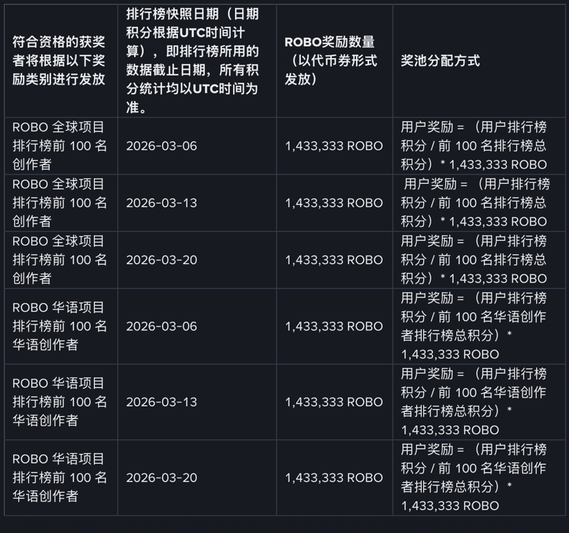 Activitatea este împărțită în două zone mari, globală și chineză, fiecare având recompense uriașe în ROBO, evaluate la prețul actual, ceea ce reprezintă o valoare considerabilă, și recompensează doar primele 100 de locuri, iar câștigurile medii depășesc așteptările. La început, când am calculat, nu-mi venea să cred, dar după ce am verificat de mai multe ori, am confirmat că beneficiile sunt reale. Activitatea durează trei săptămâni, cu recompense săptămânale; atâta timp cât reușiți să vă clasați în primele 100 în oricare săptămână, puteți obține recompense substanțiale, iar cu cât clasamentul este mai sus, cu atât câștigurile sunt mai atrăgătoare! Totuși, beneficiile mari înseamnă o competiție acerbă, iar odată ce activitatea a început, au intrat mulți participanți, iar interesul este mult mai mare decât la proiectele similare, așa că fiecare ar trebui să participe cât mai bine posibil. În plus, în ceea ce privește prețul monedei, există un preț public care oferă suport, iar în prezent, numărul de tokeni circulanți este extrem de mic, iar după ce diverse airdrop-uri vor fi lansate, prețul monedei va fluctua probabil, iar câștigurile reale ar putea avea ușoare variații, așa că ar trebui să participați rațional.