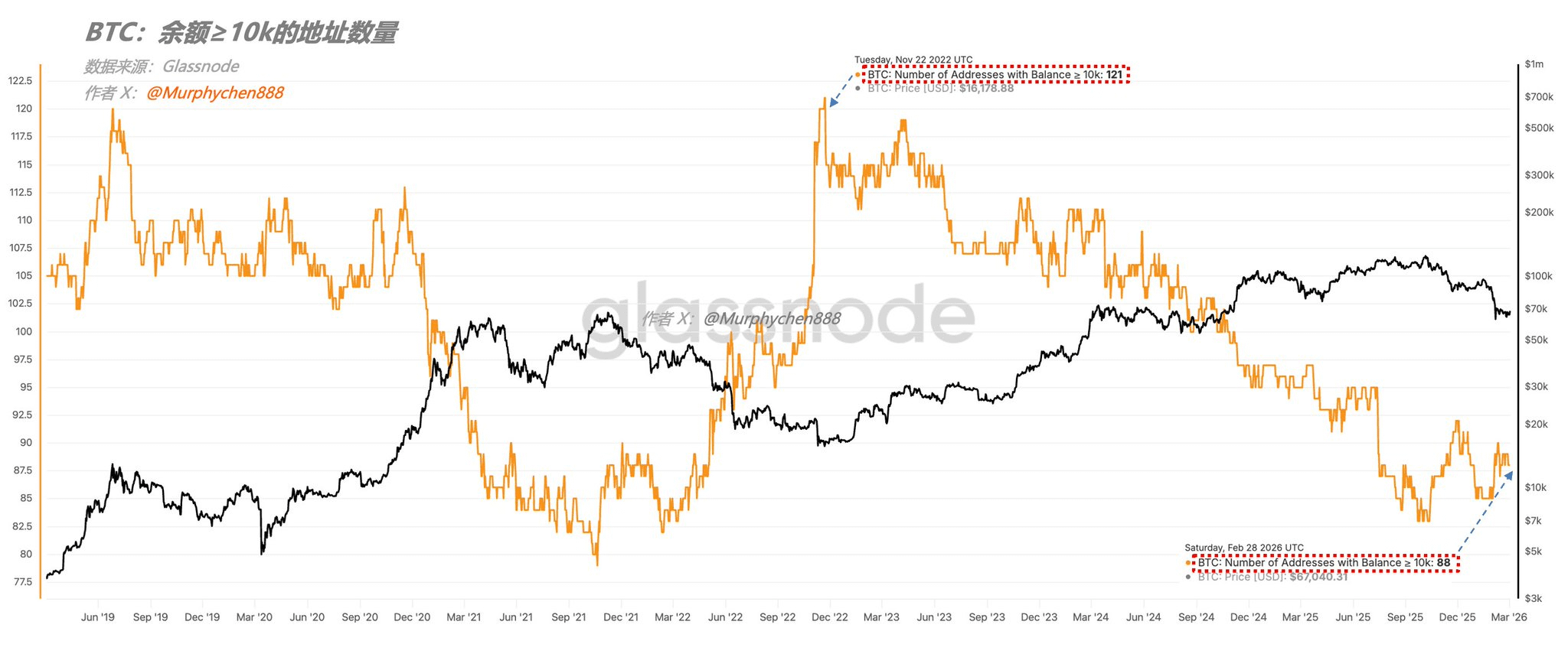他们不是某个人,或某个实体,而是一个隐秘的群体 —— Super Whale(超级鲸鱼)。根据Glassnode数据显示,当前持有 ≥ 10,000 BTC的链上地址只有88个。在22年熊底时最高有121个。
