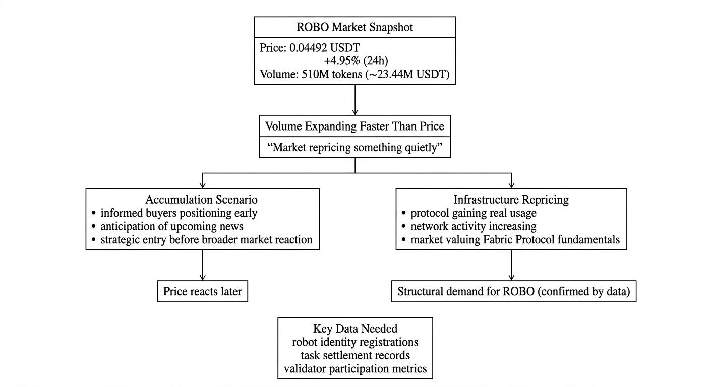 I have watched enough tokens rip on no volume to know that when volume expands faster than price, the market is sorting something out quietly. ROBO closed today at 0.04492 USDT, up 4.95 percent in the last 24 hours, with an intraday range between 0.04237 and 0.05018. That price move is fine, but it is not the part that made me pause. What caught my attention was the volume explosion. ROBO printed 510 million tokens traded in 24 hours, which at current price translates to roughly 23.44 million USDT. That is a forty percent jump from yesterday's 15.86 million USDT, and it arrived while price only moved five percent. Volume expanding that fast while price stays relatively calm usually means one of two things. Either accumulation is happening ahead of information the broader market does not have yet, or the token is being repriced by participants who care more about Fabric Protocol's structural positioning than they do about short term chart momentum. I am leaning toward the latter, and here is why that matters for anyone tracking ROBO as more than just another AI robotics narrative play.