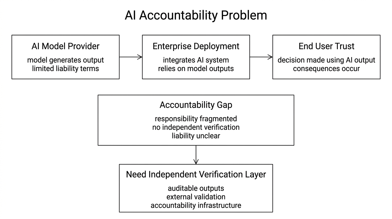 Something I keep noticing in conversations about enterprise AI deployment is that the accountability question always comes last. Teams spend months evaluating model performance, latency, cost per token, integration complexity. Then someone in legal or compliance asks the question that should have come first: if this system produces a wrong output that causes harm, who is responsible? The room gets quiet. There is no clean answer. The model provider has terms of service limiting liability. The enterprise deploying it made the integration decision. The end user trusted the output. Accountability is distributed so thinly across that chain that it effectively disappears. That is not a legal edge case. It is the central unresolved problem of deploying AI in any context where being wrong has real consequences. And it is the problem Mira Network is building infrastructure to address.
