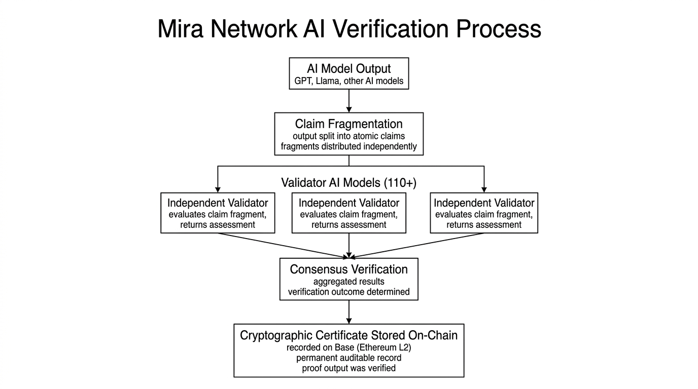 Mira is not trying to build a better AI model. That distinction is worth sitting with. The project is building a verification layer that sits above existing AI models entirely — source-agnostic, meaning it works regardless of which model produced the output. The protocol takes an AI response, breaks it into individual verifiable claims, and routes those fragments across a network of over 110 independent AI models that assess them separately without coordination. Consensus across those assessments produces a cryptographic certificate recorded permanently on Base, Ethereum's Layer 2. That certificate is the receipt the accountability chain currently lacks. It does not prove the output is correct with absolute certainty. It proves the output was independently checked by a decentralized network and that the result is auditable by anyone, forever. In regulated environments, that distinction between probably right and verifiably checked matters enormously.