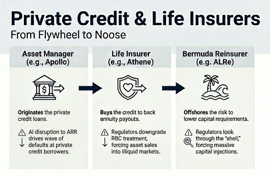 损失冲击了为持有非流动资产对冲长久期义务而构建的资产负债表。那个本应让系统具有韧性的"永久资本",不是什么抽象的耐心机构资金池和老练投资者承担的老练风险。它是美国家庭的储蓄——"普通人"的钱——以年金形式结构化,投向了正在违约的同一批 PE 支持的软件和科技资产。那些无法跑路的锁定资本是人寿保险投保人的钱,而那里的规则不太一样。