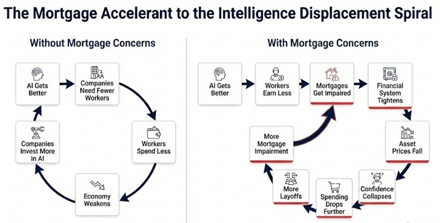 这是一个没有天然刹车的负反馈循环。人类智能替代螺旋。白领工人的收入能力(以及合理地,他们的消费)遭受结构性损害。他们的收入是 13 万亿美元抵押贷款市场的基石——迫使承销商重新评估优质抵押贷款是否还能保全。
