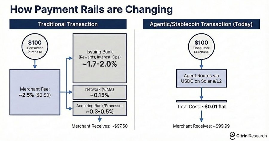 比价和聚合能做的有限。反复为用户省钱的最大方式(尤其当 agent 开始互相交易时)是消除费用。在机器对机器的商业中,2-3%的银行卡交换费成了显而易见的目标。