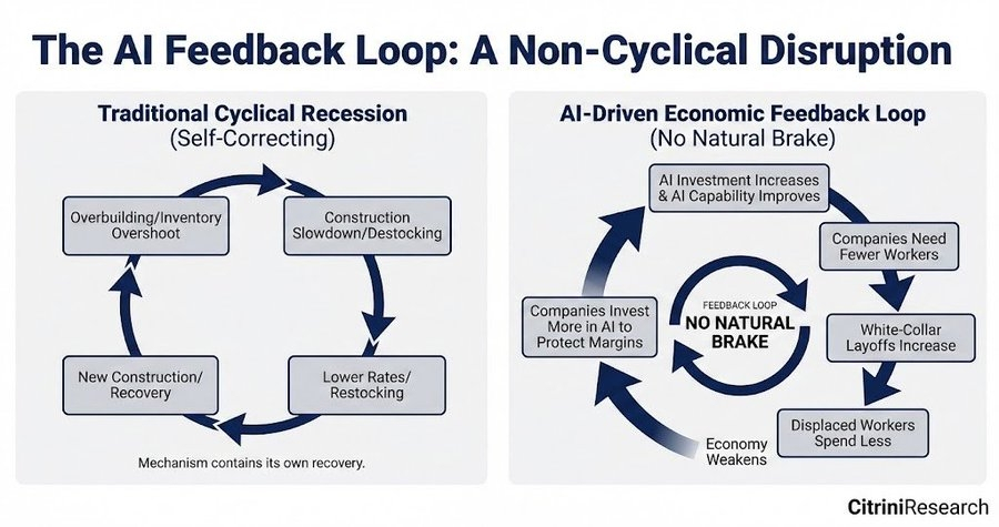 第一个负反馈循环在实体经济中:AI 能力提升 → 工资支出收缩 → 消费走软 → 利润率收紧 → 企业购买更多 AI → 能力继续提升。然后它转向了金融:收入损害冲击抵押贷款 → 银行损失收紧信贷 → 财富效应崩裂 → 反馈循环加速。两者都因政府不充分的政策应对而雪上加霜——政府坦白说,看起来很困惑。
