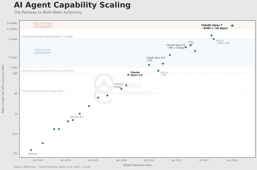 如今,AI agent 处理着长达数周的研发任务。指数增长碾碎了我们对可能性的认知,尽管每年 Wharton 的教授们都试图把数据套进一条新的 S 型曲线。
