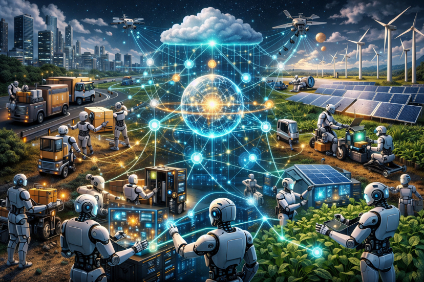 Imagine a world where delivery robots, agricultural robots, and maintenance robots operate across cities and farms. Some robots may even maintain solar infrastructure or help harvest new forms of energy. These robots would not operate independently. Instead, they would connect to a shared network where skills, data, and computing resources are distributed across the system. When one robot learns how to repair a device or optimize a process, that capability could propagate across the entire network.
