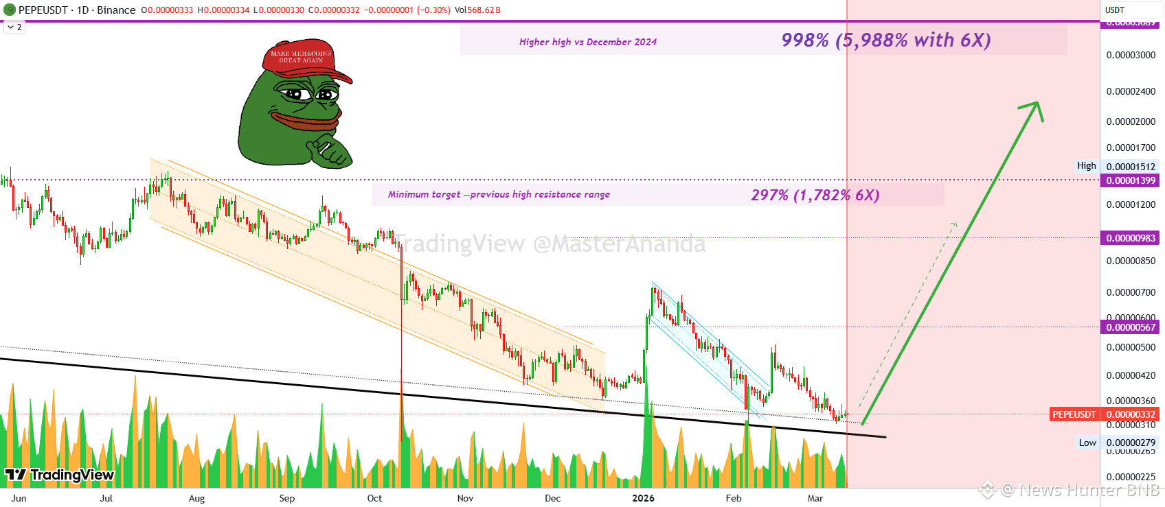 بعد أكثر من شهر، لا يزال $PEPE USDT يتداول ضمن نفس هيكل المخطط. وهذا يجعل الإعداد السابق، الذي قمنا بزيارته في أوائل فبراير، أقوى بكثير.