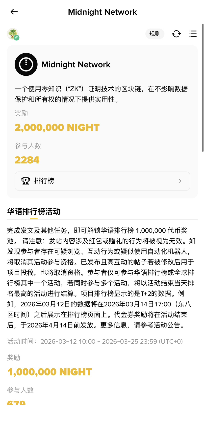 现在参与活动,完成发帖等任务,就能冲华语排行榜,瓜分1,000,000枚$NIGHT 大奖池!