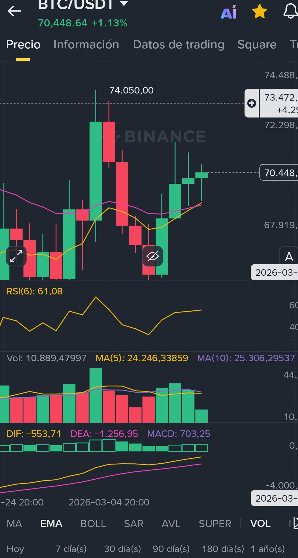 Zona de Conflicto: El precio está "lateralizando" justo debajo de los $71,300. Es positivo que estemos por encima de las EMAs diarias, pero el volumen está disminuyendo mientras el precio sube ligeramente. Eso es una divergencia que huele a falta de gasolina.