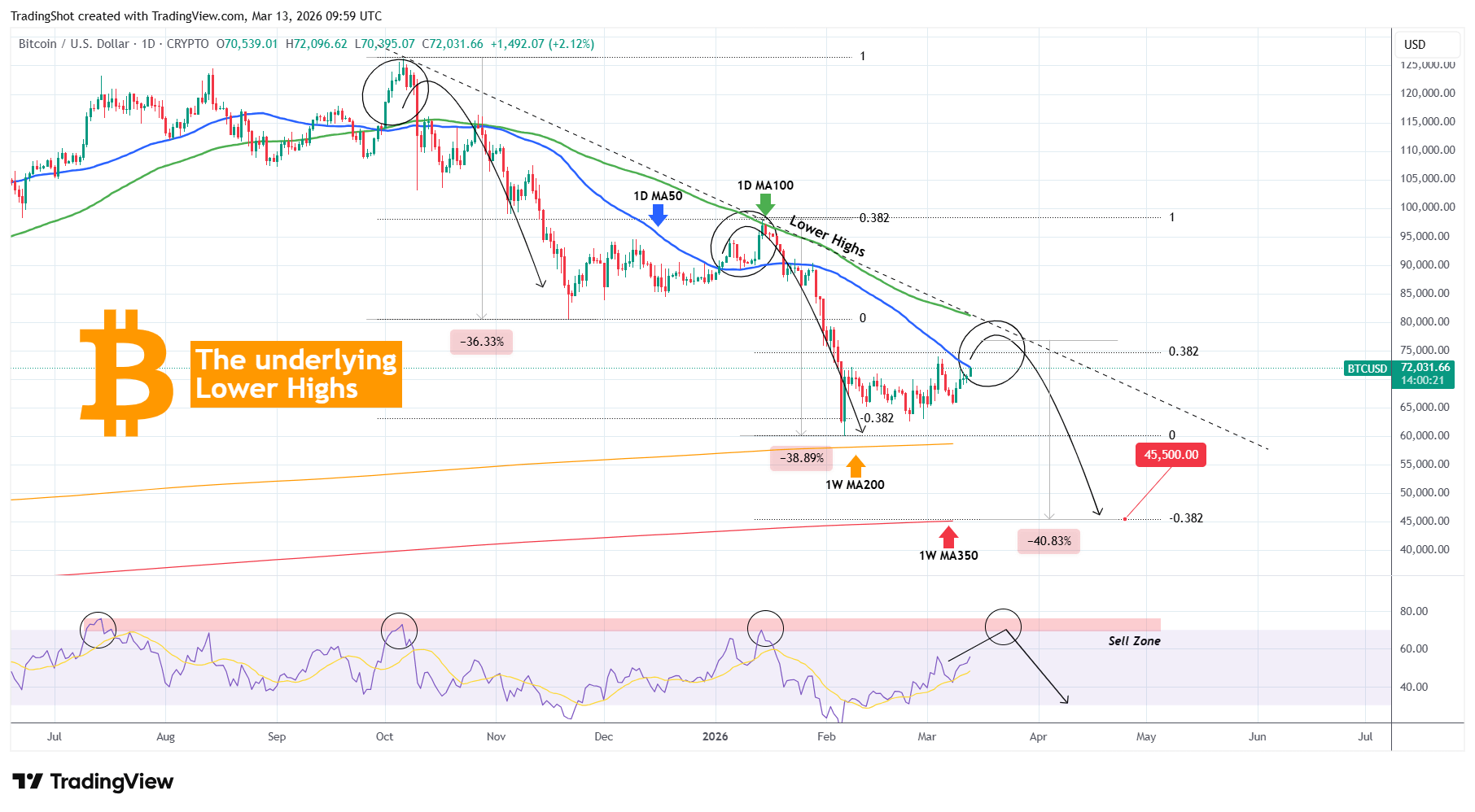 Dacă acest lucru se întâmplă în cele din urmă, și având în vedere simetria ridicată până acum a Ciclu în cadrul Picioarelor Păguboase, ne așteptăm ca următoarea vânzare să vizeze zona $47500 - 45500, care ar fi în cadrul MA350 de 1S (linia de tendință roșie) și extensia Fibonacci -0.382 (aceasta a fost Ținta Picioarelor anterioare). MA350 de 1S este important deoarece este locul unde Ciclu Păgubos din 2022 a atins minimul și următoarea Suport MA după MA200 de 1S (linia de tendință portocalie), care a susținut al 2-lea Picior Păgubos.