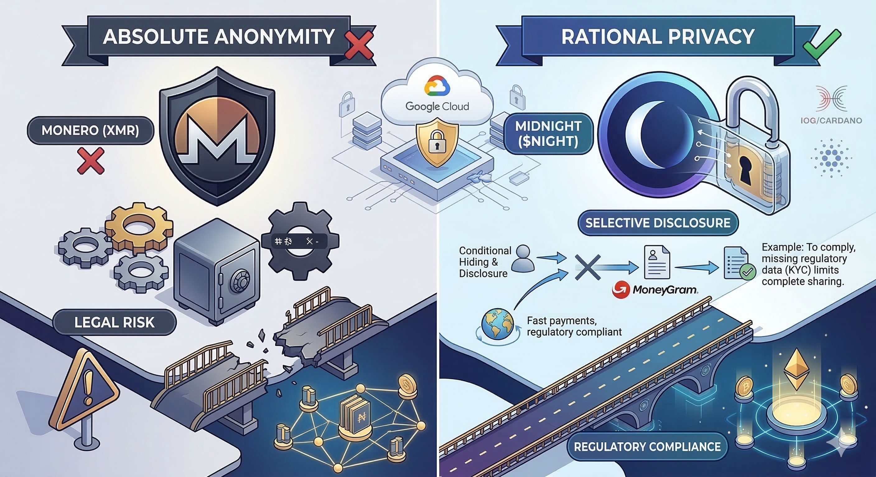 Câu trả lời nằm ở khái niệm "Quyền riêng tư có lý trí" (Rational Privacy). Khác với Monero hay Zcash – những dự án thường gặp rắc rối pháp lý do tính ẩn danh tuyệt đối – Midnight cho phép tiết lộ có chọn lọc.