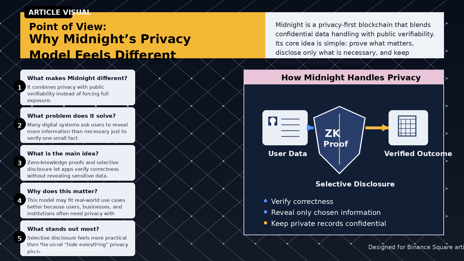 I can see why Midnight is getting attention right now. On paper, the case is strong. Midnight describes itself as a privacy-first blockchain that combines confidential data handling with public verifiability, and its docs repeatedly frame the network around selective disclosure rather than blanket secrecy. The pitch is easy to understand: let users and applications prove what matters without exposing everything underneath. In a market where most chains still default to radical transparency, that is a real and serious proposition.
