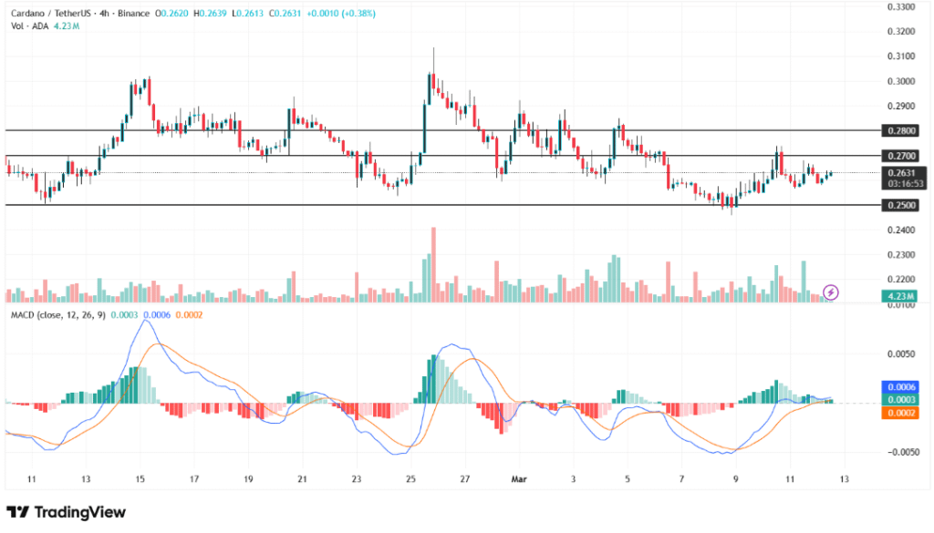 ADA holds key support near $0.25 while resistance at $0.27 limits rallies, leaving the market focused on a potential move toward $0.30.