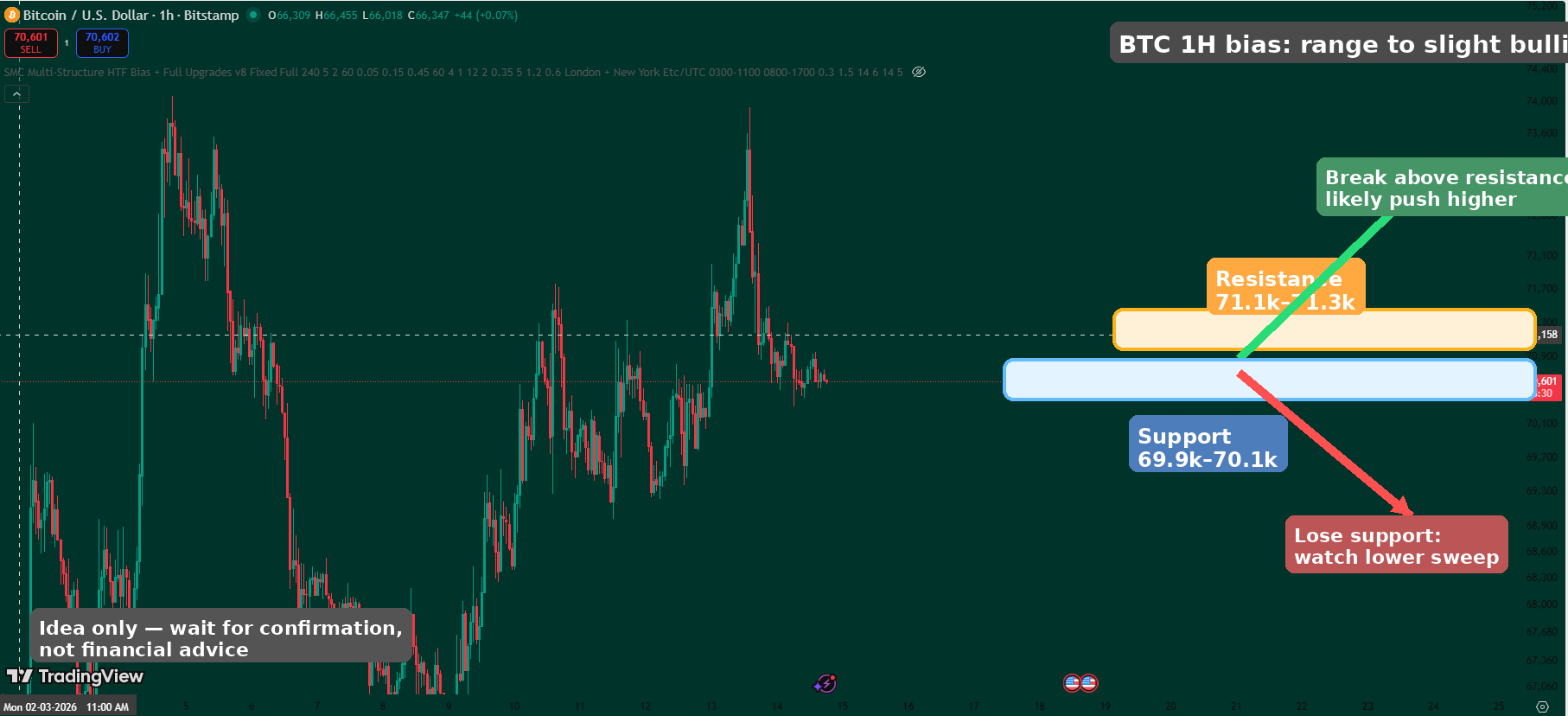 • Above 71.0k–71.2k: stronger bullish continuation