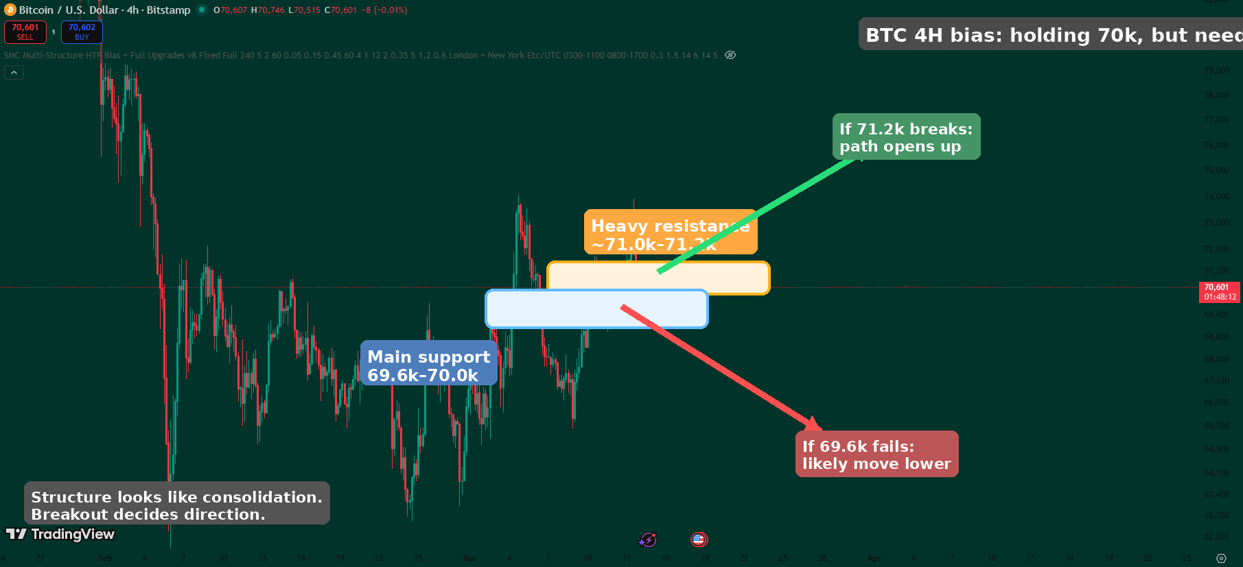 • Holding 69.6k–70.0k: still range / slight bullish