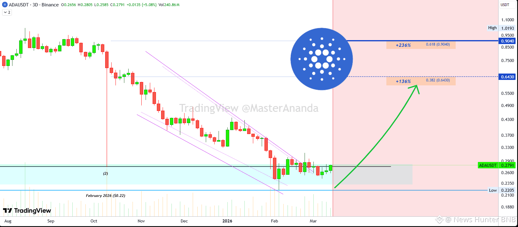 $ADA يتداول ضمن منطقة شراء الفرصة القصوى، نطاق سعري بين أدنى مستويات أكتوبر 2025 وفبراير 2026، بالضبط في المنتصف. هذه فرصة.