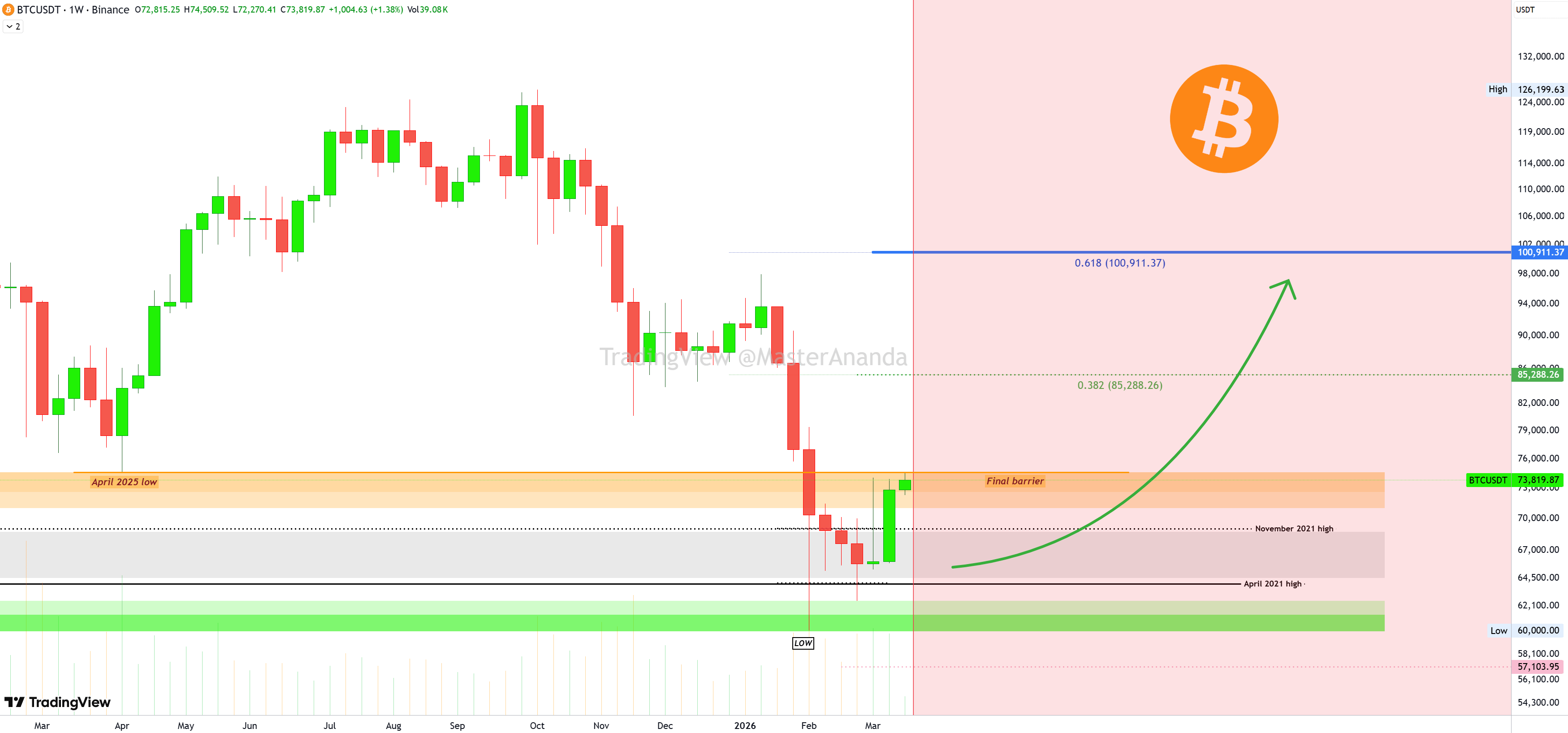 Suportul nu mai este o întrebare. Săptămâna trecută, Bitcoin a produs cea mai bună sesiune din aprilie 2025, aproape un an în urmă. Doar o "barieră finală" rămâne pentru o creștere foarte puternică... Prețul minim din aprilie 2025 și zona de rezistență în jurul valorii de $74,500. Când acest nivel va fi spart, validat pe deplin, o avansare majoră este deja în desfășurare și confirmată.