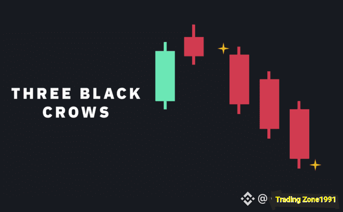 Ele sunt echivalentul bearish al celor trei soldați albi. De obicei, aceste lumânări nu au fitile superioare lungi, indicând că presiunea de vânzare continuă să împingă prețul mai jos. Dimensiunea lumânărilor și lungimea fitilelor pot fi de asemenea folosite pentru a judeca șansele de continuare a tendinței descendente.