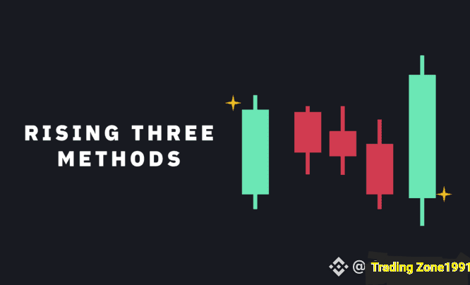 Modelul de lumânări în creștere cu trei metode apare într-o tendință ascendentă în care trei lumânări roșii consecutive cu corpuri mici sunt urmate de continuarea tendinței ascendente. Ideal, lumânările roșii nu ar trebui să rupă zona lumânării anterioare.