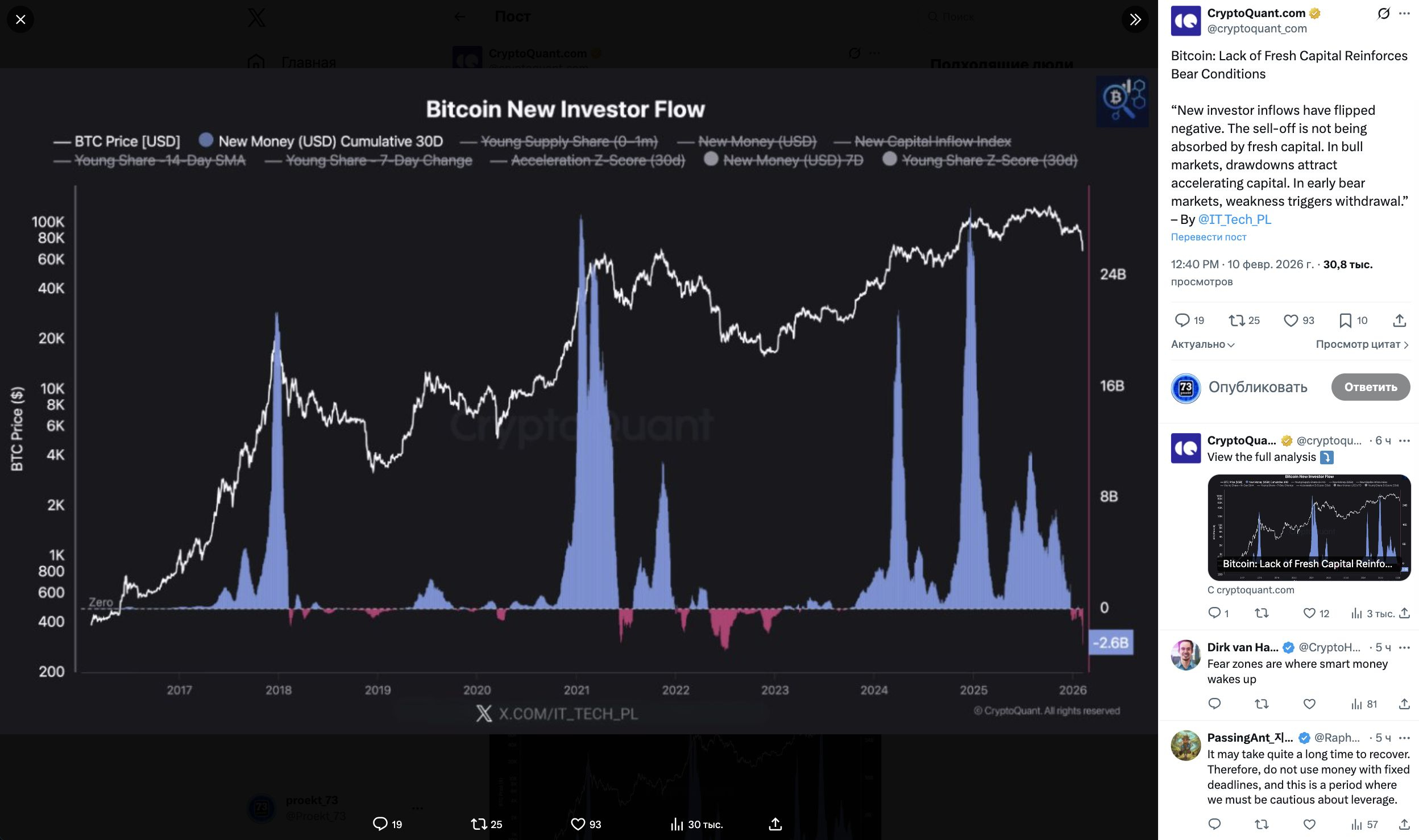 По графику Bitcoin New Investor Flow от CryptoQuant видно, что индикатор new money уходит в отрицательную область. Текущая отметка около -2,6 млрд (сальдо "новых денег" за 30 дней). На фоне этого даже отскоки выглядят как технические, пока не появится устойчивый приток.