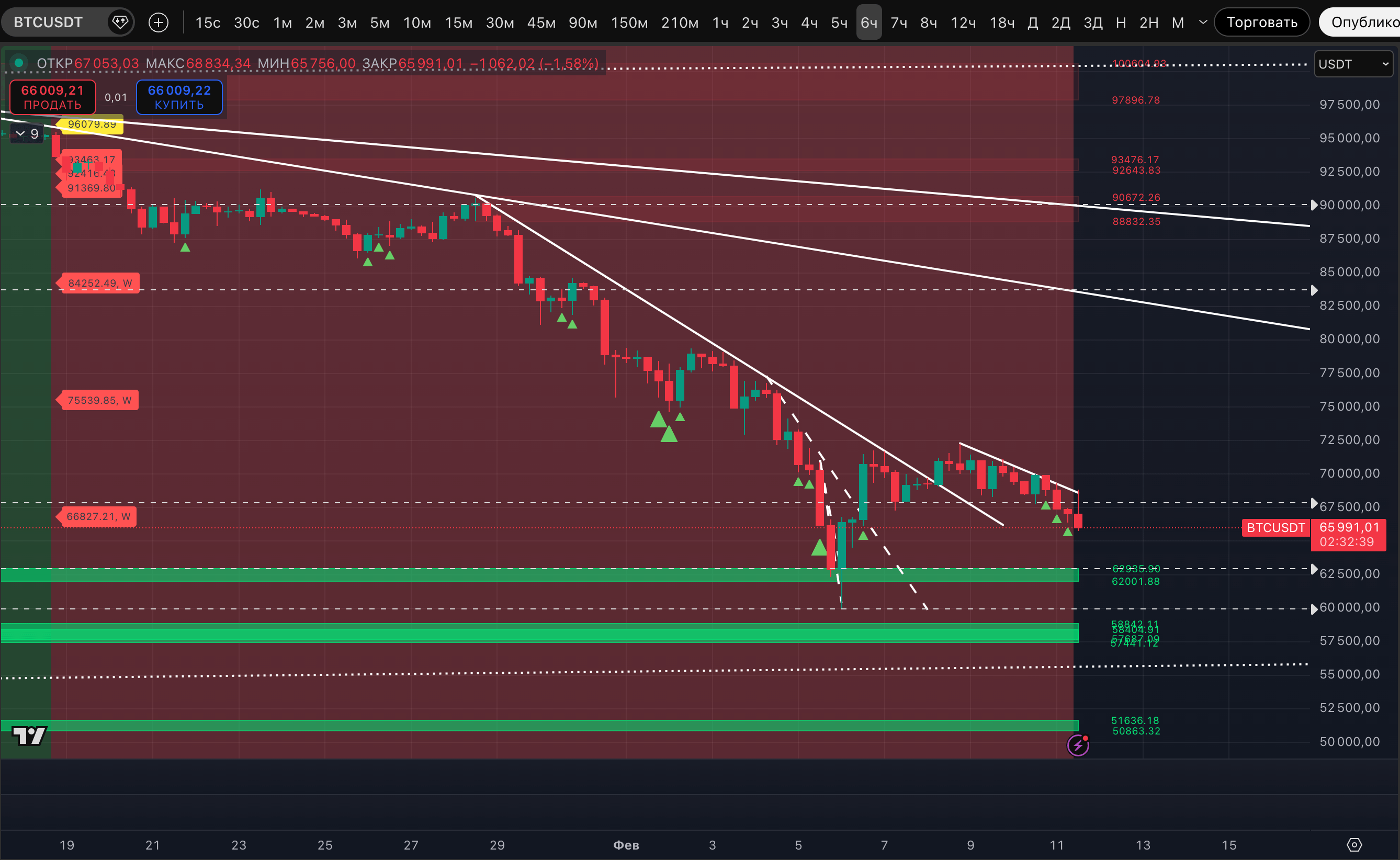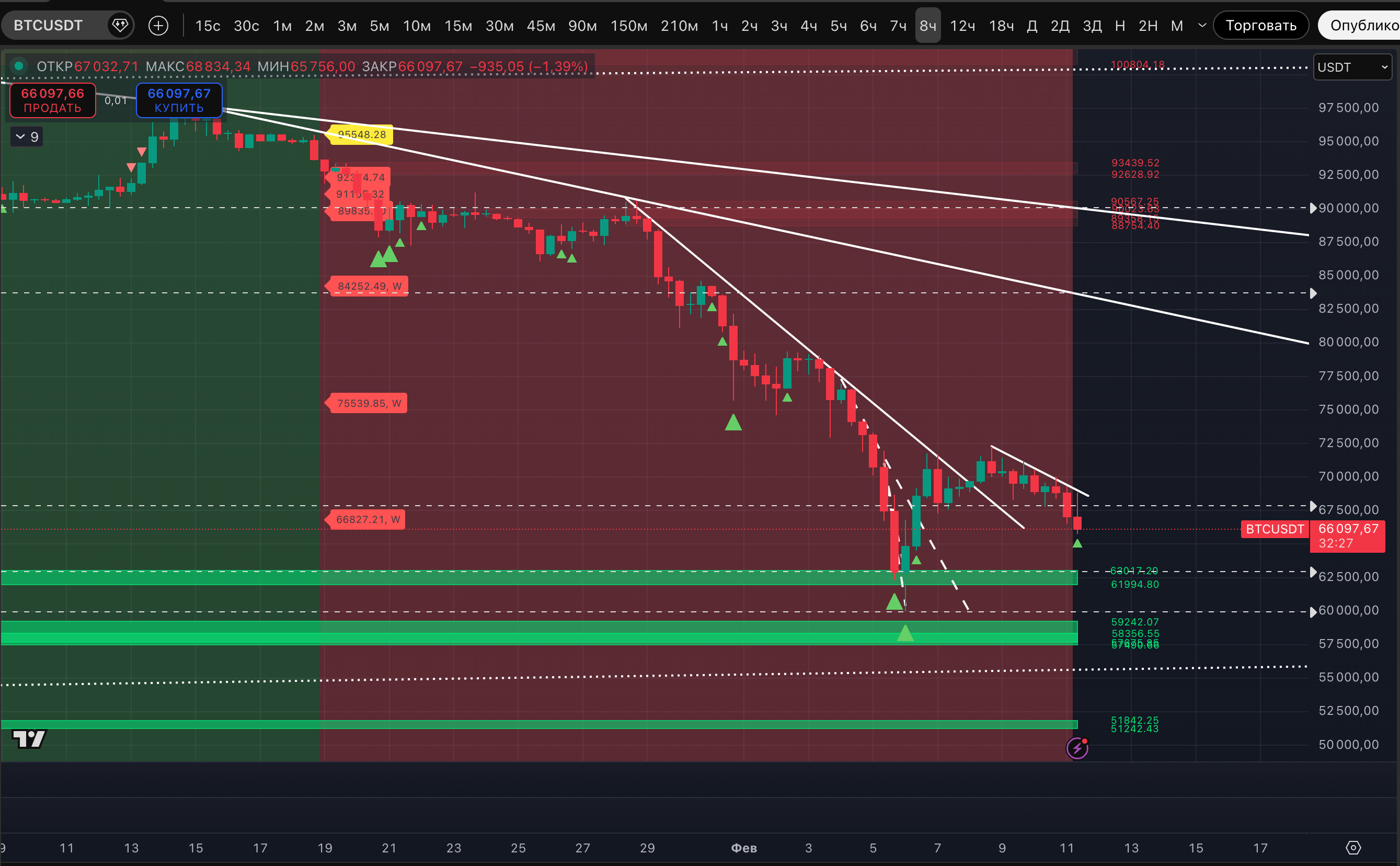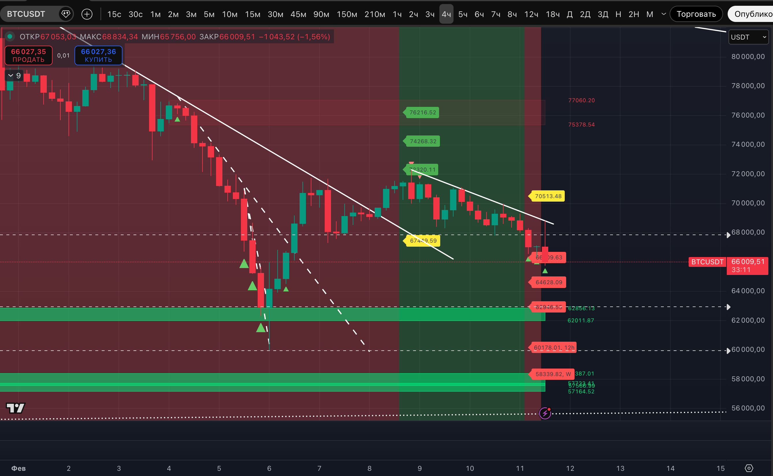 При этом перенесем позицию в положительный безубыток если до момента старта нового отскока цена достигнет третью базовую цель (62 946$). Сегодня были эксперименты с симуляцией рынка, где такая стратегия помогала минимизировать убыточные сделки.