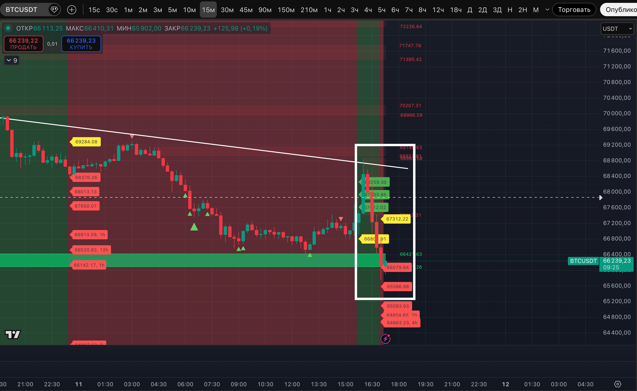 На часовом ТФ цена ударила в зону ликвидности 68 750-69 278$ и тут же откатилась, показав активные продажи.
