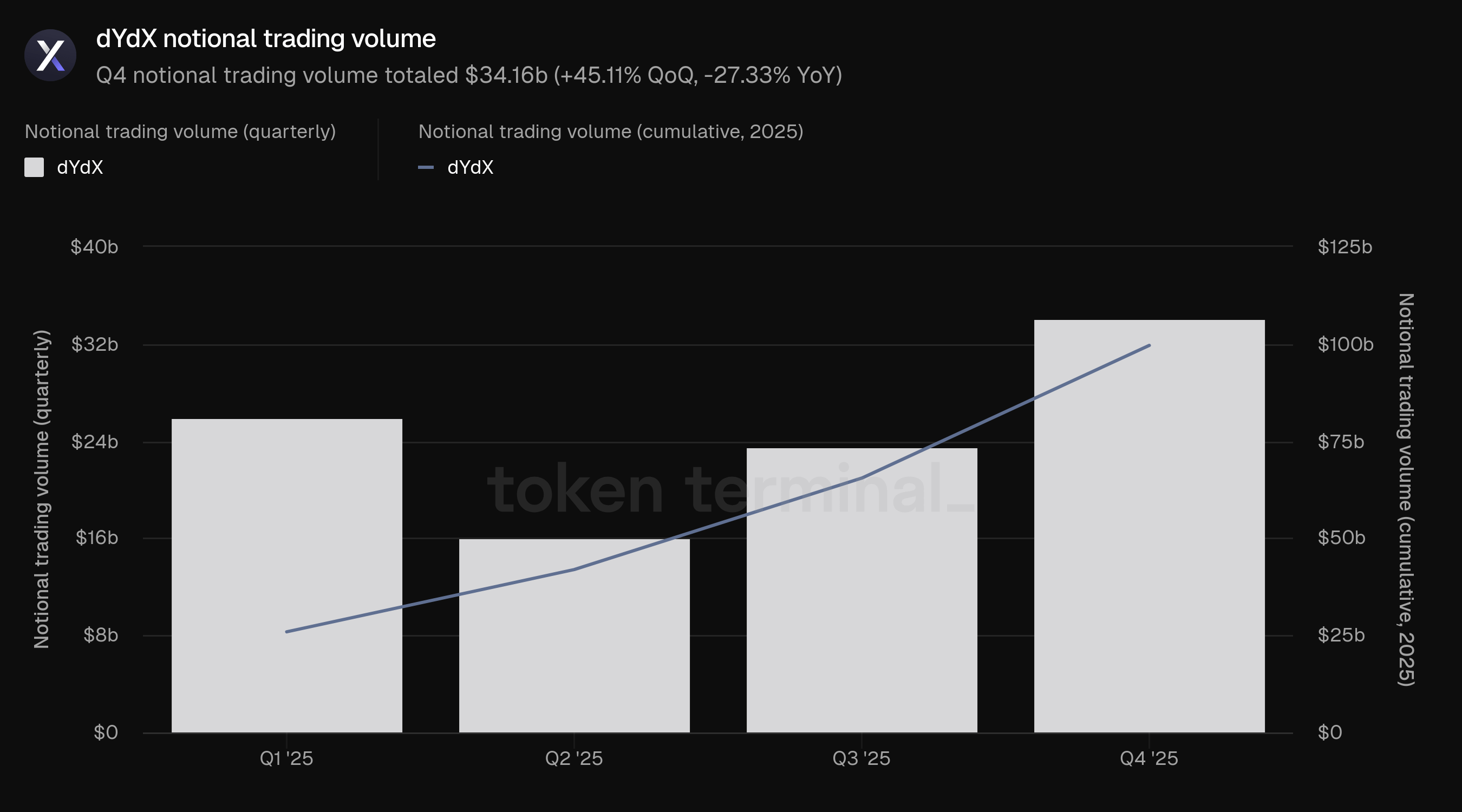"Q4 2025 стал явной точкой поворота для dYdX, с объемом торгов, достигнувшим примерно $34.16 млрд, увеличившись с $23.54 млрд в Q3 и $16.04 млрд в Q2, что сделало его самым сильным кварталом года. Ускорение было вызвано тремя основными факторами: восстановлением участия в рынке после снижения заемных средств во втором квартале, когда волатильность нормализовалась, и трейдеры снова развернули капитал после сбоя на рынке 10 октября; улучшением качества исполнения и глубины ликвидности, поддерживаемых расширенной институциональной маршрутизацией и более целенаправленными программами стимулов; и более высоким участием активных трейдеров, с еженедельными активными трейдерами в Q4, достигшими примерно 12.70 тыс., самого высокого уровня 2025 года.