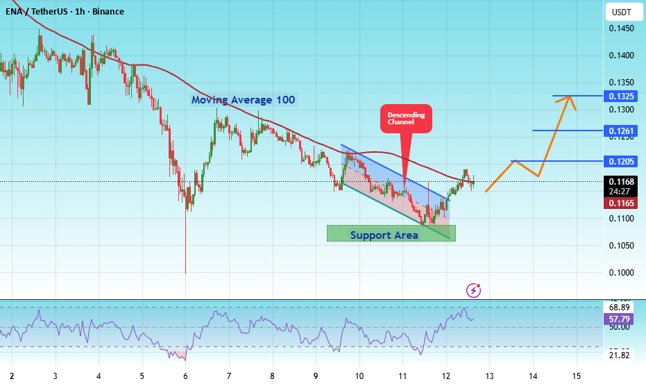 Существует ключевая зона поддержки в зеленом цвете на уровне 0.1070. Цена уже несколько раз отскакивала от этого уровня и ожидается повторный отскок.