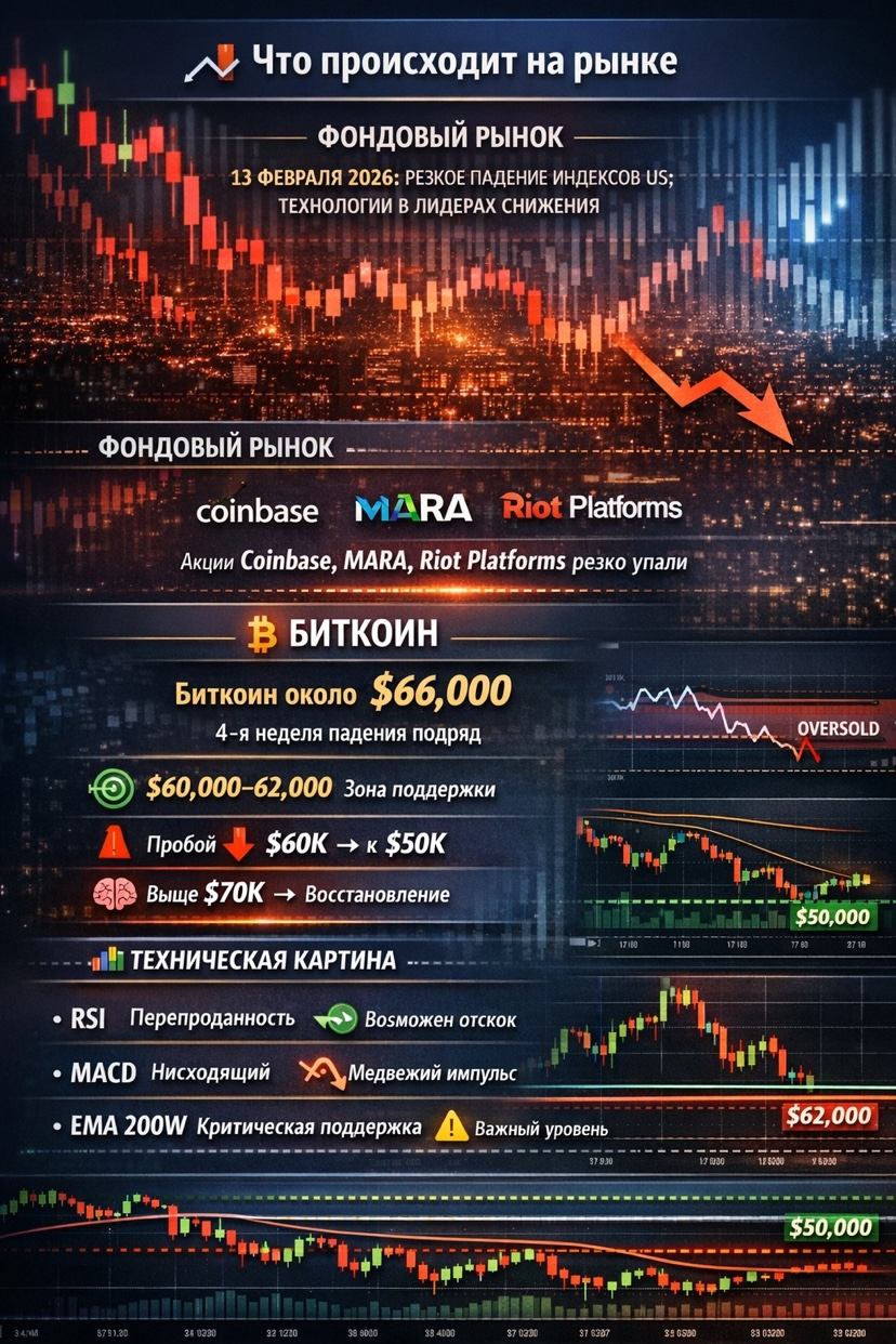13 февраля 2026 года индексы US акций закрылись резким снижением, при этом технологические акции возглавили падение на фоне озабоченности по поводу оценки AI