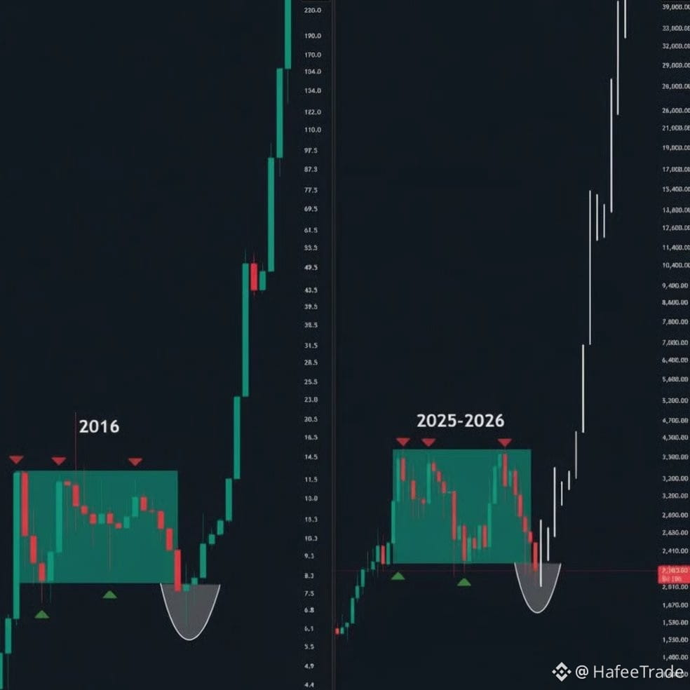Crypto market phir se wohi kahani repeat karta hua lag raha hai. Chart clearly dikha raha hai ke 2016 wali consolidation phase aur 2025–2026 ka structure almost same pattern follow kar rahe hain.