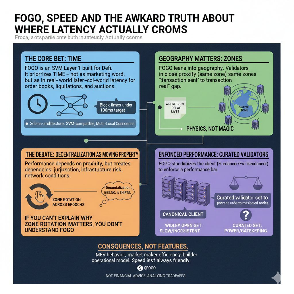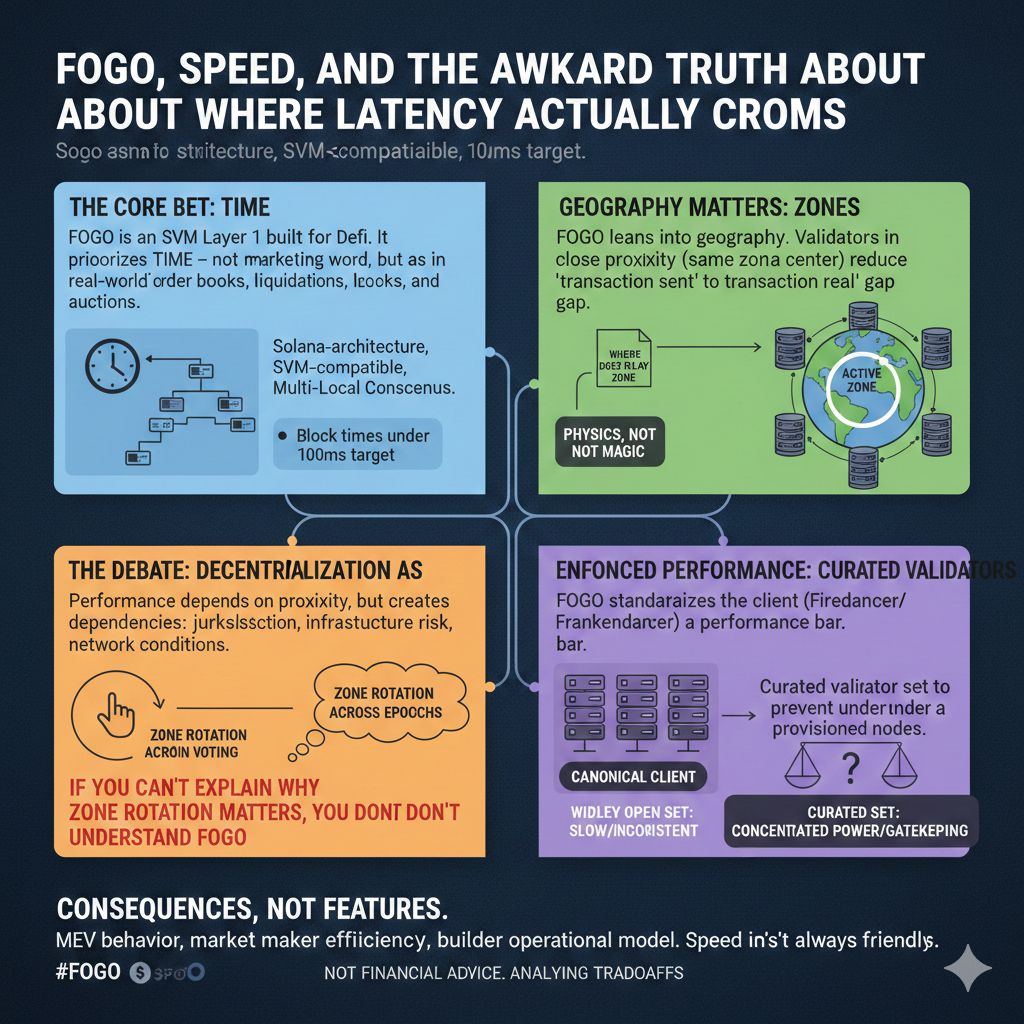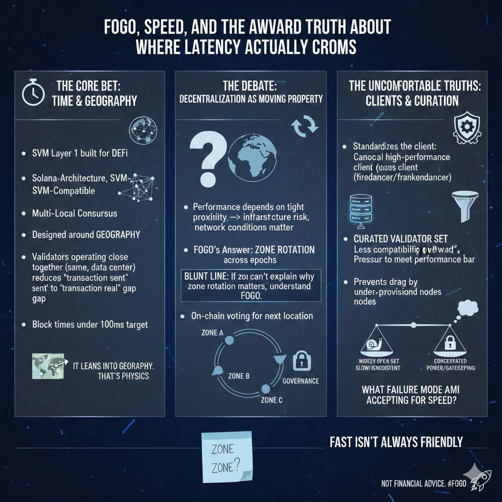If you’re posting about @fogo just to tick a box, you’ll run out of ideas fast. The only way to keep writing something real is to look at what Fogo is actually betting onand why that bet is a little uncomfortable for people who treat “decentralization” like a slogan instead of an engineering trade.Fogo is an SVM Layer 1 built for DeFi that cares about one thing more than most chains admit: time. Not “time” as a marketing word. Time as in whether an onchain order book can behave like an order book, whether liquidations land when they should, whether auctions feel crisp instead of mushy. The docs put it plainly: it’s Solana-architecture, SVM-compatible, and designed around multi-local consensus to push latency down. That’s the core. Everything else is decoration.Here’s the detail that matters and that most people skip: Fogo doesn’t pretend the internet is flat. It leans into geography. Validators operating close togethersame zone, ideally even the same data centerreduces the gap between “transaction sent” and “transaction becomes real.” The architecture page even spells out the idea of zones co-locating to approach hardware limits, with block times under 100ms as the target in that setup. That’s not magic, it’s physics.But let’s be honest: this is where the debate starts, not where it ends.Because if performance depends on tight proximity, you’re also admitting that where the active zone sits changes the chain’s lived reality. Different jurisdiction, different infrastructure risk, different network conditions. Fogo’s answer is rotation: move the zone across epochs so the system doesn’t permanently anchor itself to one place, and use on-chain voting to coordinate the next location. That’s clever. It’s also a reminder that decentralization isn’t a constant “yes/no” switchit can become a moving property that shifts with operations and governance.Blunt line: if you can’t explain why zone rotation matters, you don’t understand what makes Fogo different.