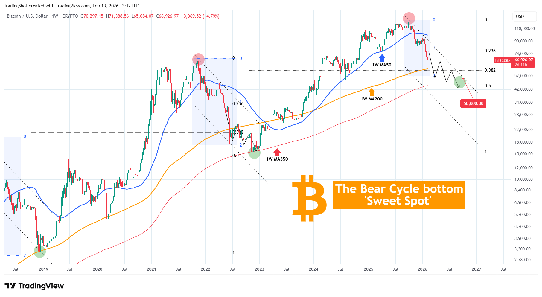 В настоящее время это около $51000, и зона внутри этого диапазона и 0.5 Фибоначчи откат от дна медвежьего цикла (около $45000) является 'Сладким Местом'. Практически это 'безошибочная' зона покупки с циклической точки зрения, где долгосрочные инвесторы могут начать чувствовать себя достаточно комфортно, чтобы снова начать покупки. Мы уже обсуждали, почему дно 1W MA350 (красная линия тренда) технически имеет смысл, так как именно здесь дно медвежьего цикла 2022 года.