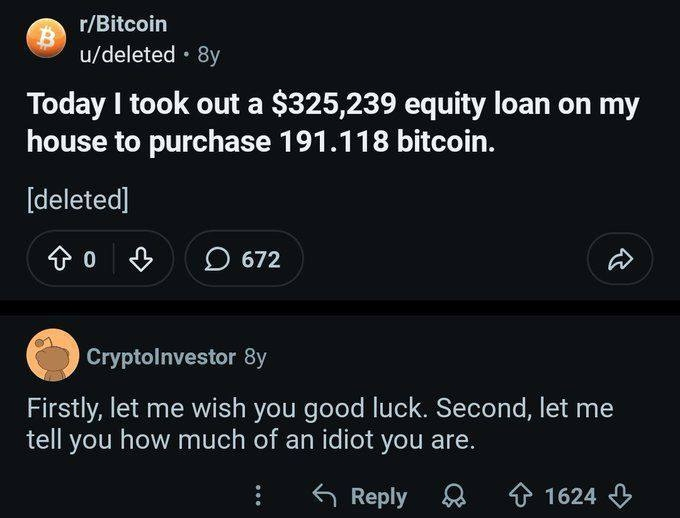 8 лет назад пользователь Reddit взял кредит под залог дома на сумму $325,239, чтобы купить 191.118 $BTC