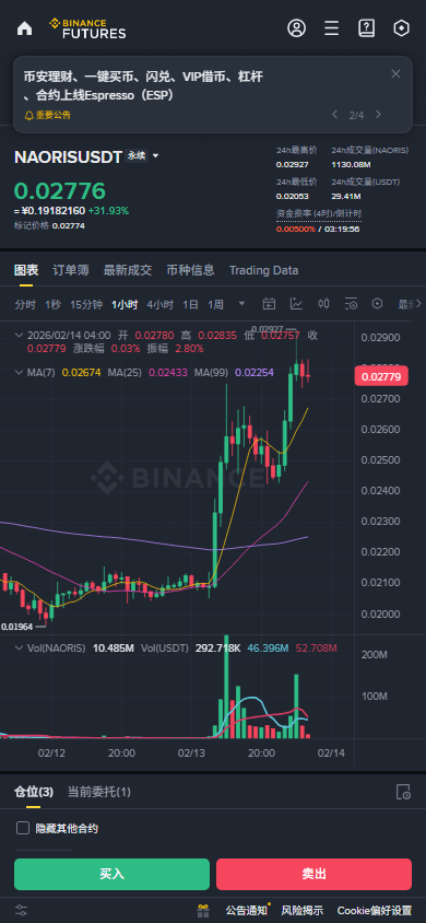 $NAORI 1H级别在经历昨日31%的暴力拉升后,目前正处于高位旗形整理末端。价格在0.0277附近强势横盘,1H EMA20(0.0254)已上穿EMA50(0.0237)形成多头排列,构成强力支撑。4H级别一根巨阳突破前期震荡箱体,趋势已转为多头,当前为健康回调。盘口深度显示买盘(0.0276-0.0275)堆积远厚于卖盘(0.0277-0.0278),失衡率达15.92%,主力护盘意图昭然若揭。RSI 1H虽处73高位,但在强势行情中可视为强势区,非反转信号。OI稳定,未见资金大幅流出,结合正资金费率,市场看涨情绪稳固。