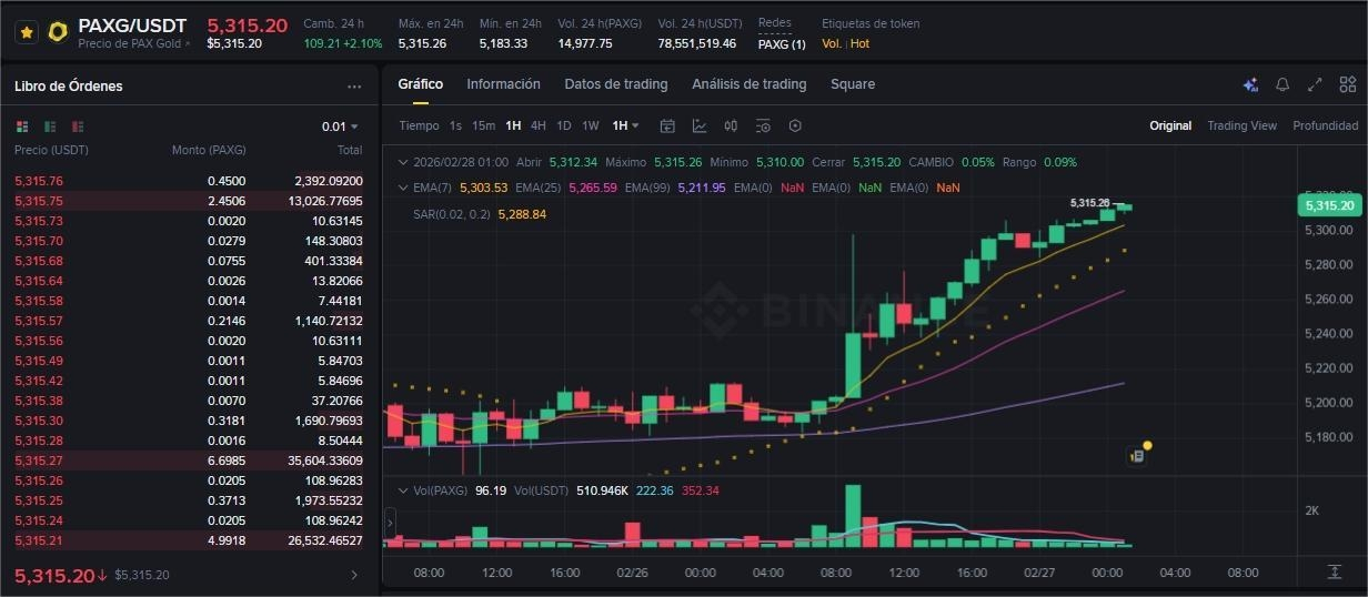 ¡El escenario alcista se ha confirmado! El precio ha roto las resistencias previas con mucha violencia y actualmente cotiza en $5,315.21, marcando un alza del +2.10% en las últimas 24 horas.