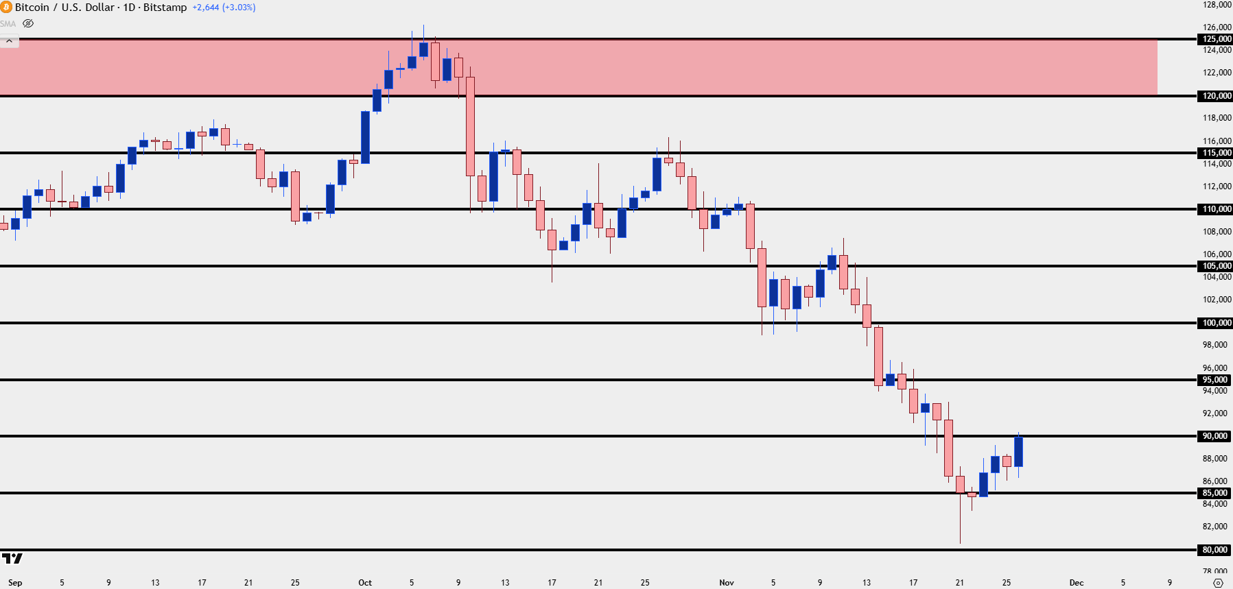 It’s been a painful six-week run in Bitcoin as a -35.69% sell-off took over. But, as the old saying goes, major tops or bottoms like to make themselves known, and the reaction around 85k last Friday has made a mark, and that has since led into a shift with prices now building back up to the 90k level.